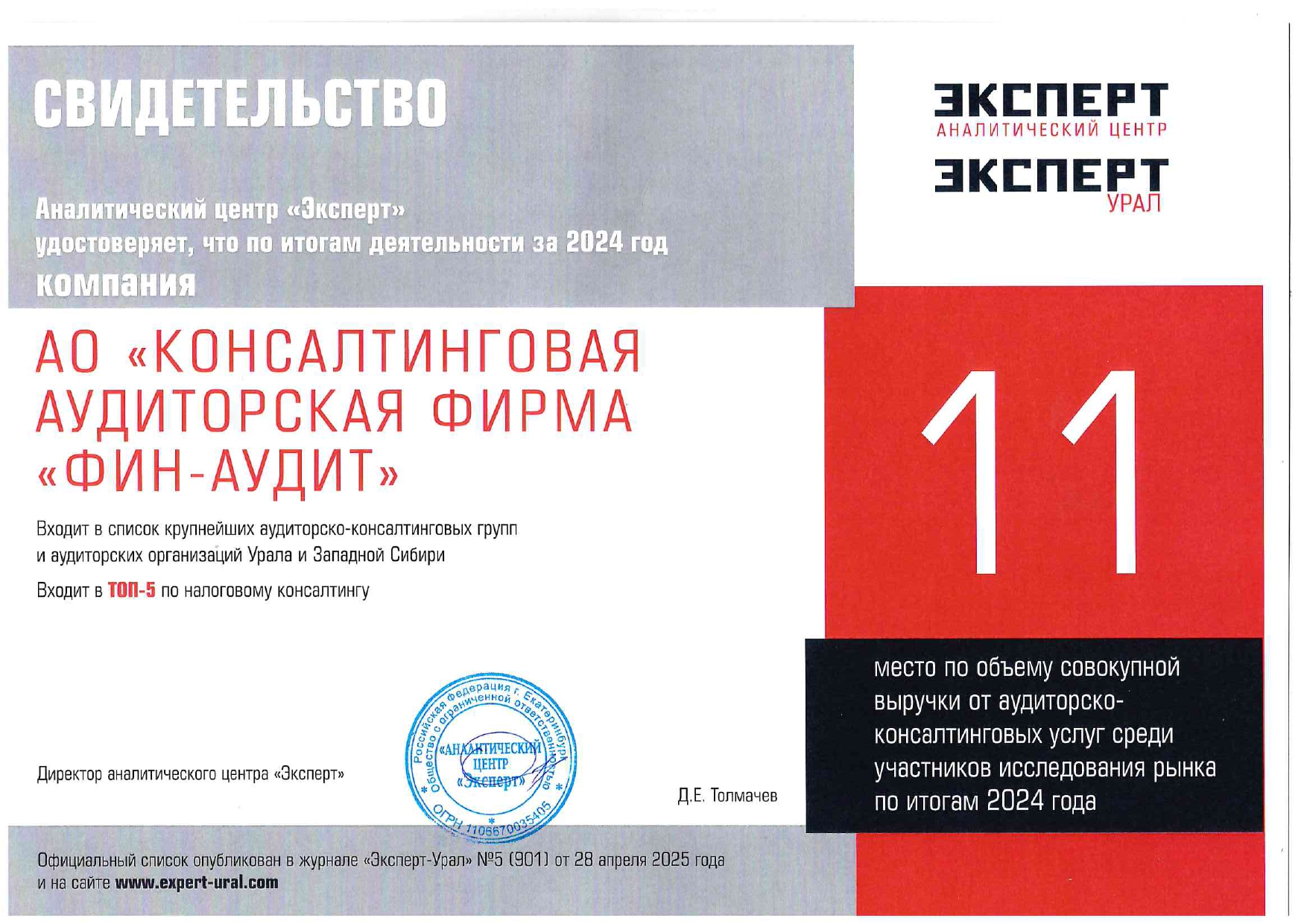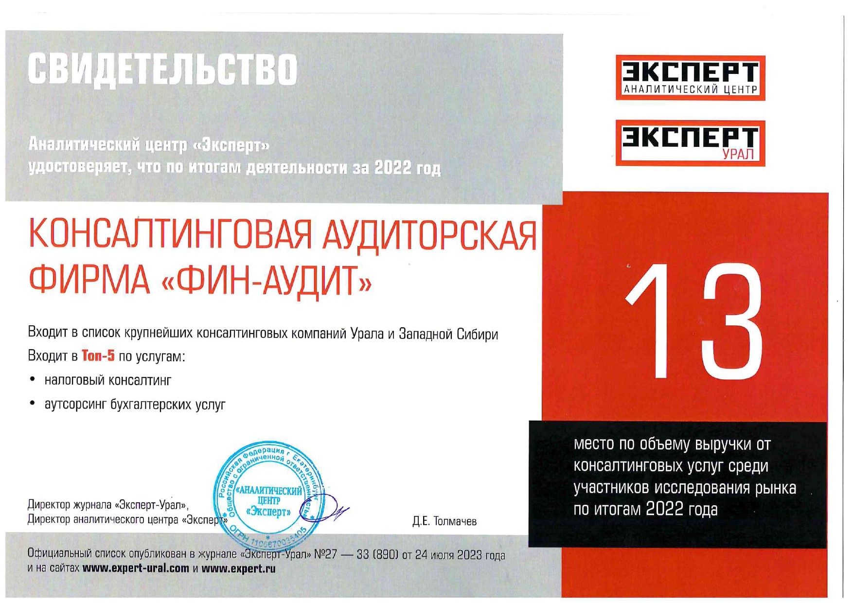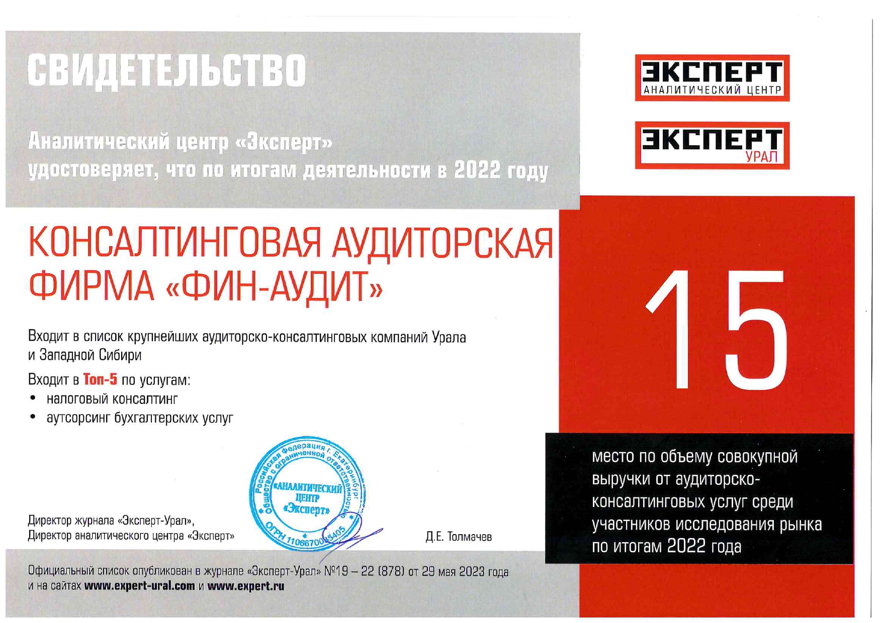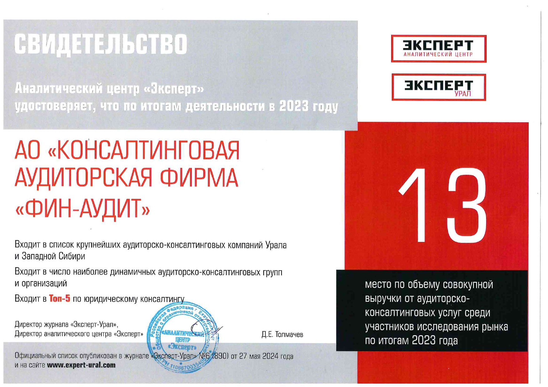 По результатам заключения независимой экспертной комиссии услуги предприятия ЗАО КОНСАЛТИНГОВАЯ АУДИТОРСКАЯ ФИРМА «ФИН-АУДИТ» получили очень высокую оценку, и были отмечены высшей наградой отборочного этапа Конкурса – Золотой медалью по Челябинской области. Уверены, что их качество будет постоянно на высоте!